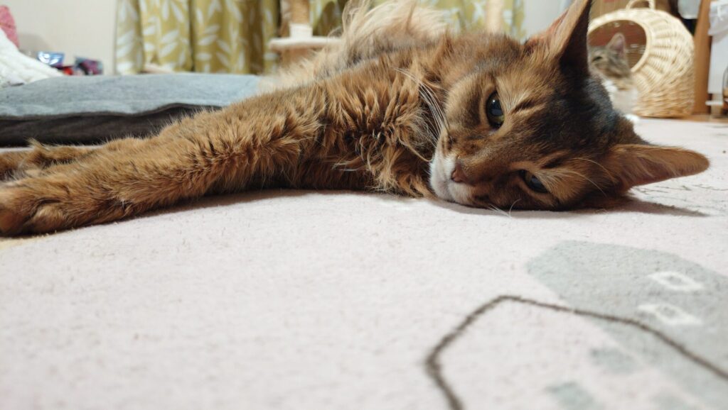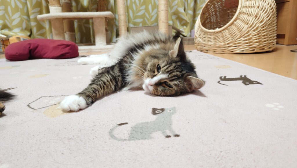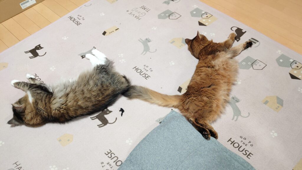 リビングでまったり過ごすノルウェージャンフォレストキャットのトトとソマリのチー